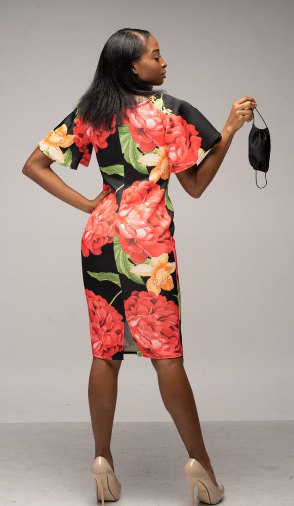 You can safely social distance when you wear this fun frock to your next event equipped with matching mask! This body conscious dress has full ruffled short sleeves, a wide neck and is knee length. The elegant floral print comes with the perfect mask to match so you can wear this garment safely while in public. Dress fits true to size.