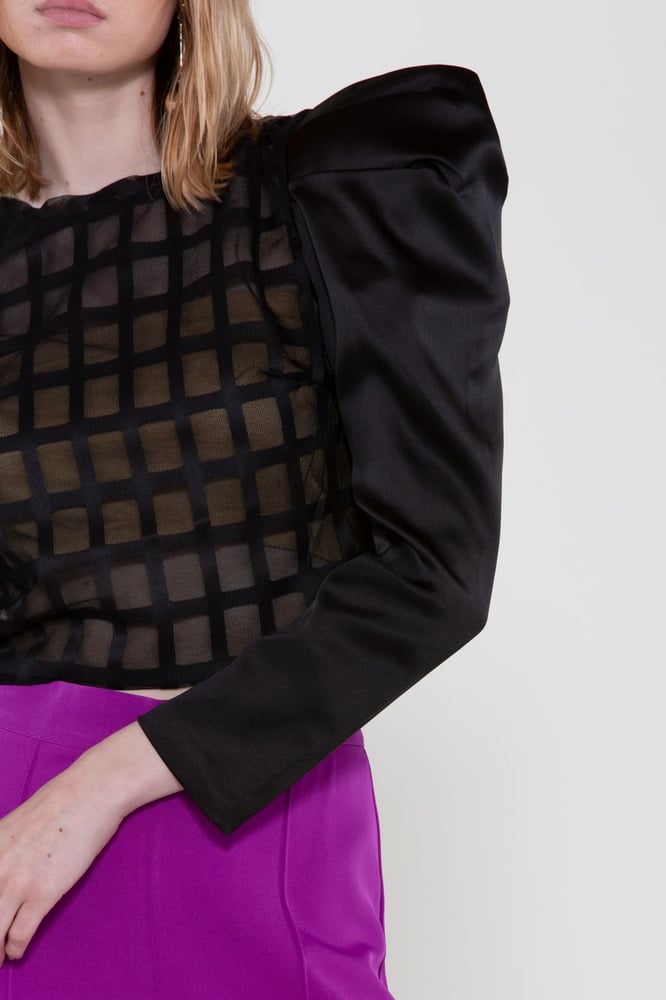 Spice up your Fall wardrobe in this sexy black mesh top with satin puff shoulder sleeve detail! Wear it with jeans, shorts, skirts or leggings. This piece is a show stopper. Top to bottom back zip closure. Shirt runs small and is slightly cropped.