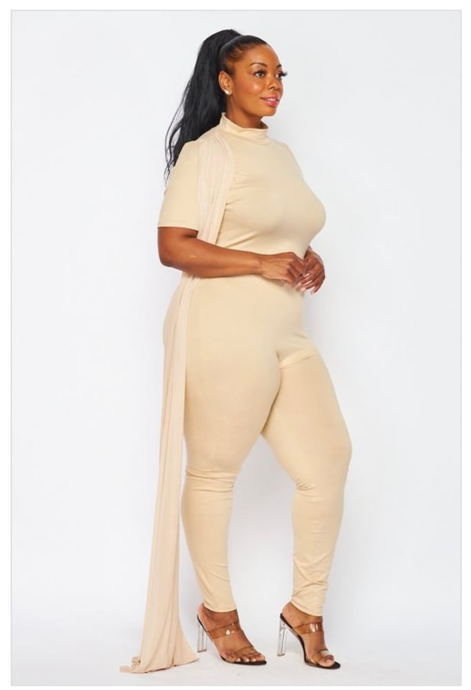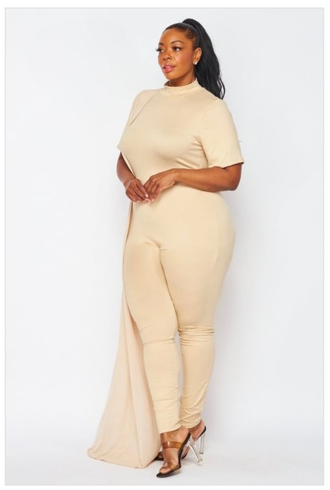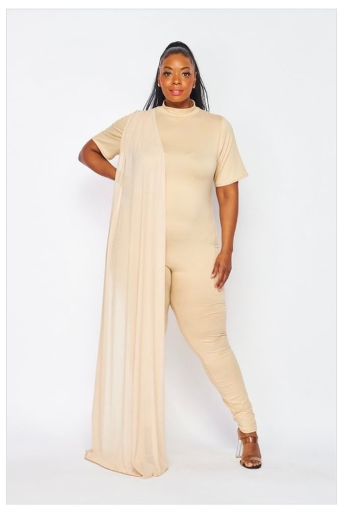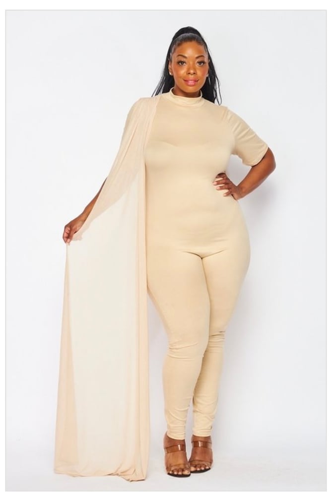 Get ready to WOW the people in this stunning, taupe jumpsuit with chiffon one-shoulder cape detail! This gorgeous piece only comes in plus sizes. The jumpsuit has a mock neck and invisible zipper back. Dress it up for a special dinner or elegant function or wear it out for a night on the town or a fun brunch with the ladies. However you rock it, you will be sure to turn heads everywhere you go!.