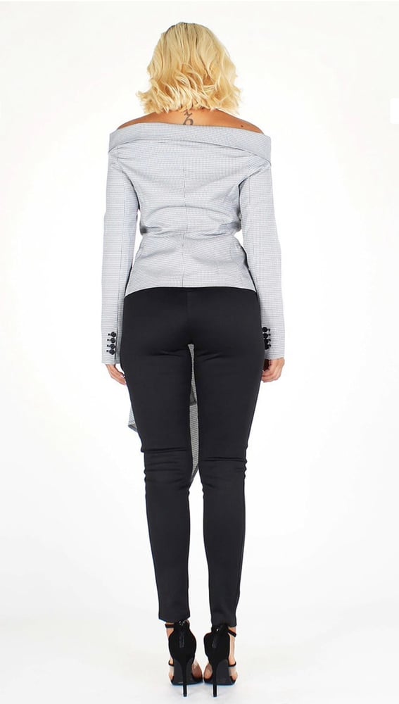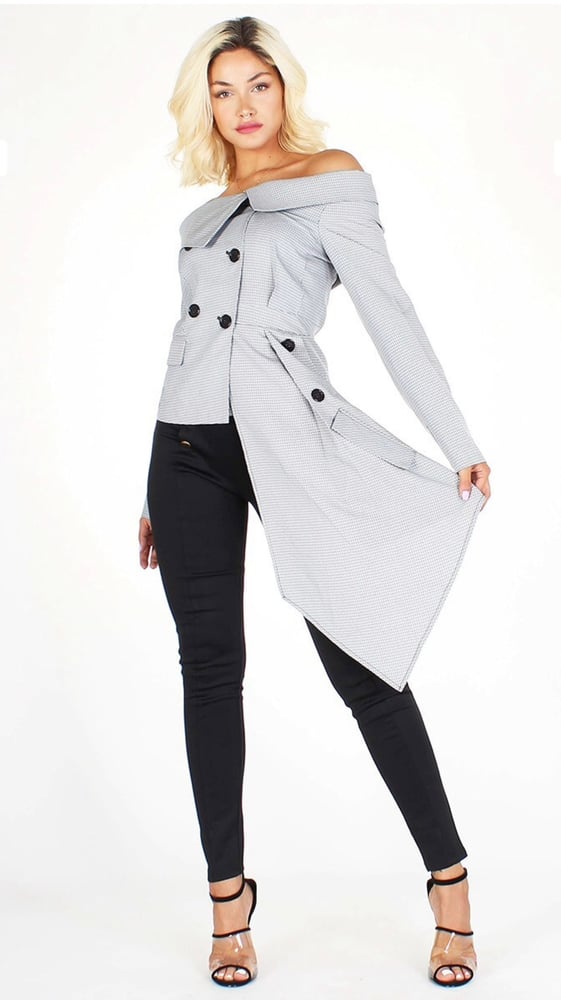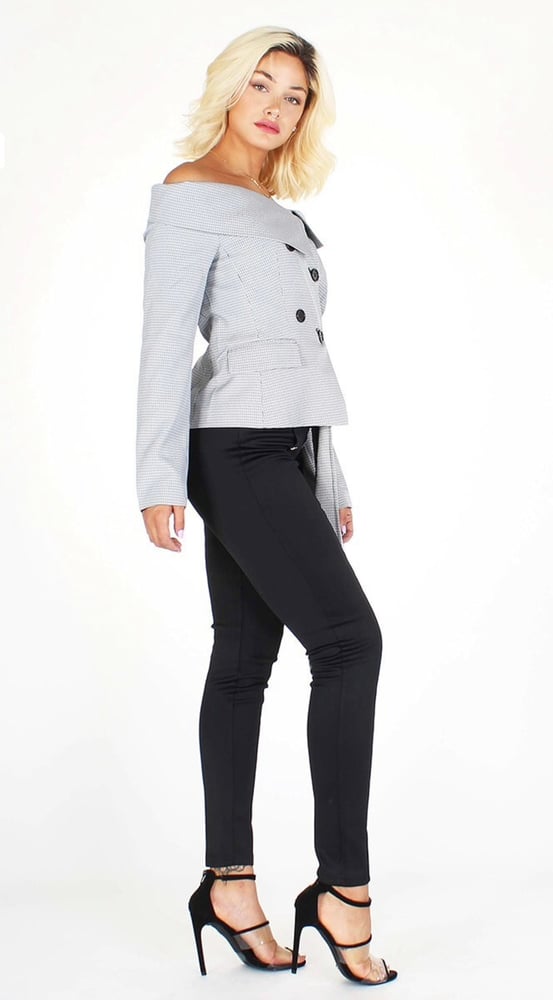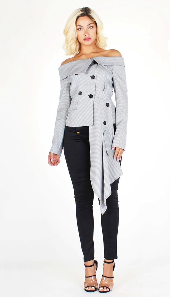 We're crazy about shoulders at feisty.L, and our LONDYN off-shoulder button top does not disappoint! This black, white and gray micro-plaid pattern top has neck to waist button closure with a fabulous extended ruffle detail over the left thigh that will turn EVERY head. Dress it up with a pencil skirt and heels or down with jeans and flats and everything in between. You can't go wrong at your next event, outing, gathering, etc. in this light-weight, chic and sophisticated take on a classic suit jacket which happens to be fully lined.