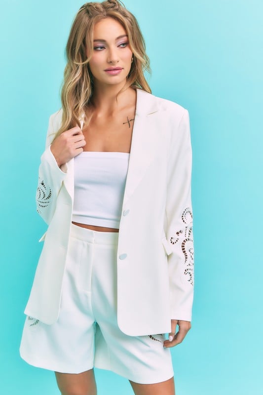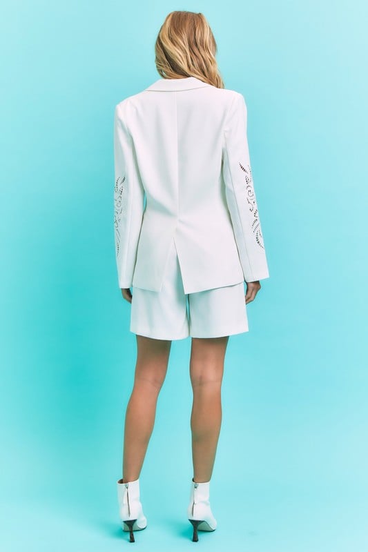 Off-White Two-Piece Set with stencil Cutout Design on sides of sleeves and shorts.