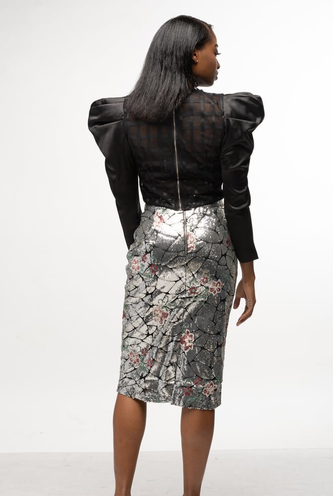 Sequin Floral Pencil Skirt - Silver
